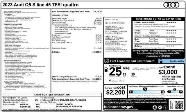 LOCATED AT 434 MEMORIAL AVE!! Carfax One Owner, Complete Service Records, Sold New Here, Local Client Trade in, Passed our Comprehensive Quality Inspection and Recently Serviced with Oil Change. .**Price excludes, tax, title, and registration fees. Includes, $799 Dealer Documentation fee. CARFAX One-Owner. Silver Metallic 2023 Audi Q5 45 S line Premium quattro quattro 7-Speed Automatic S tronic 2.0L Turbocharged **Price excludes, tax, title, and registration fees. Includes, $799 Dealer Documentation fee., Black Leather.