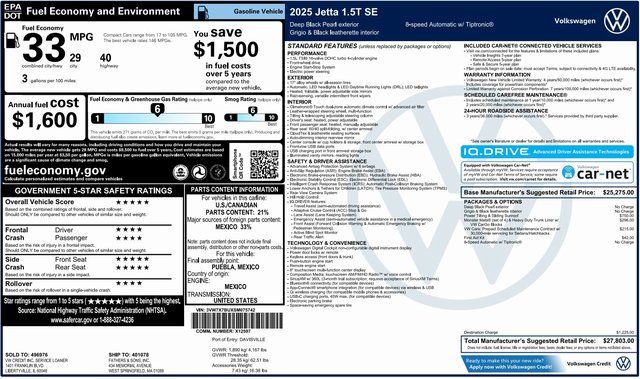 LOCATED AT 434 MEMORIAL AVE!! Carfax One Owner, Dealer Demo, Save Thousands off NEW Still Under Factory Warranty, Passed our Comprehensive Quality Inspection and Recently Serviced with Oil Change.**Price excludes, tax, title, and registration fees. Includes, $799 Dealer Documentation fee. CARFAX One-Owner. Deep Black 2025 Volkswagen Jetta 1.5T SE FWD 8-Speed Automatic with Tiptronic 1.5L I-4 DI DOHC Turbocharged **Price excludes, tax, title, and registration fees. Includes, $799 Dealer Documentation fee., Grigio/Titan Black Premium Synthetic.